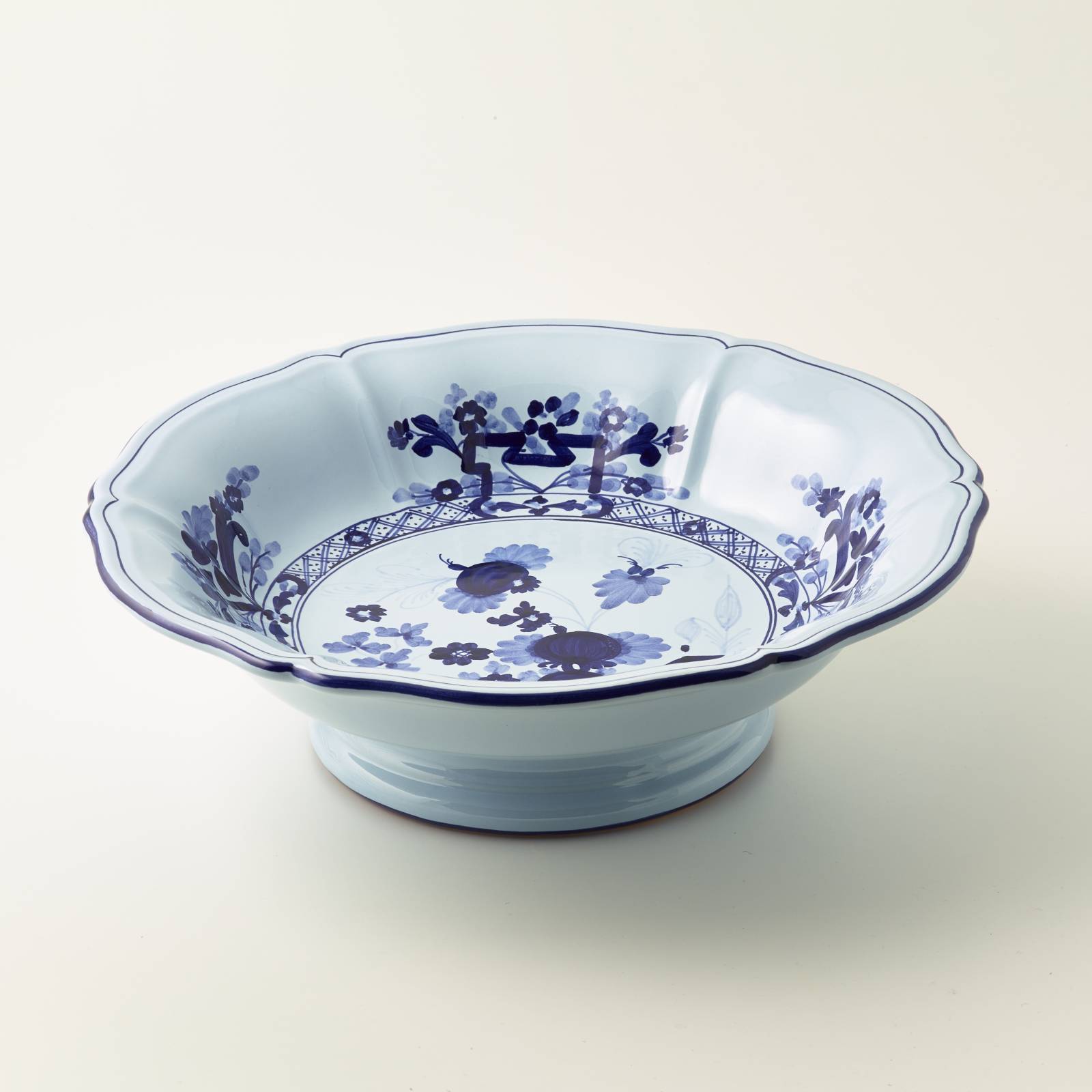 This majolica salad bowl, with stand, brings an additional dimension to the table service, thanks to the typical monochromatic blue elements of the Garofano Blu motif