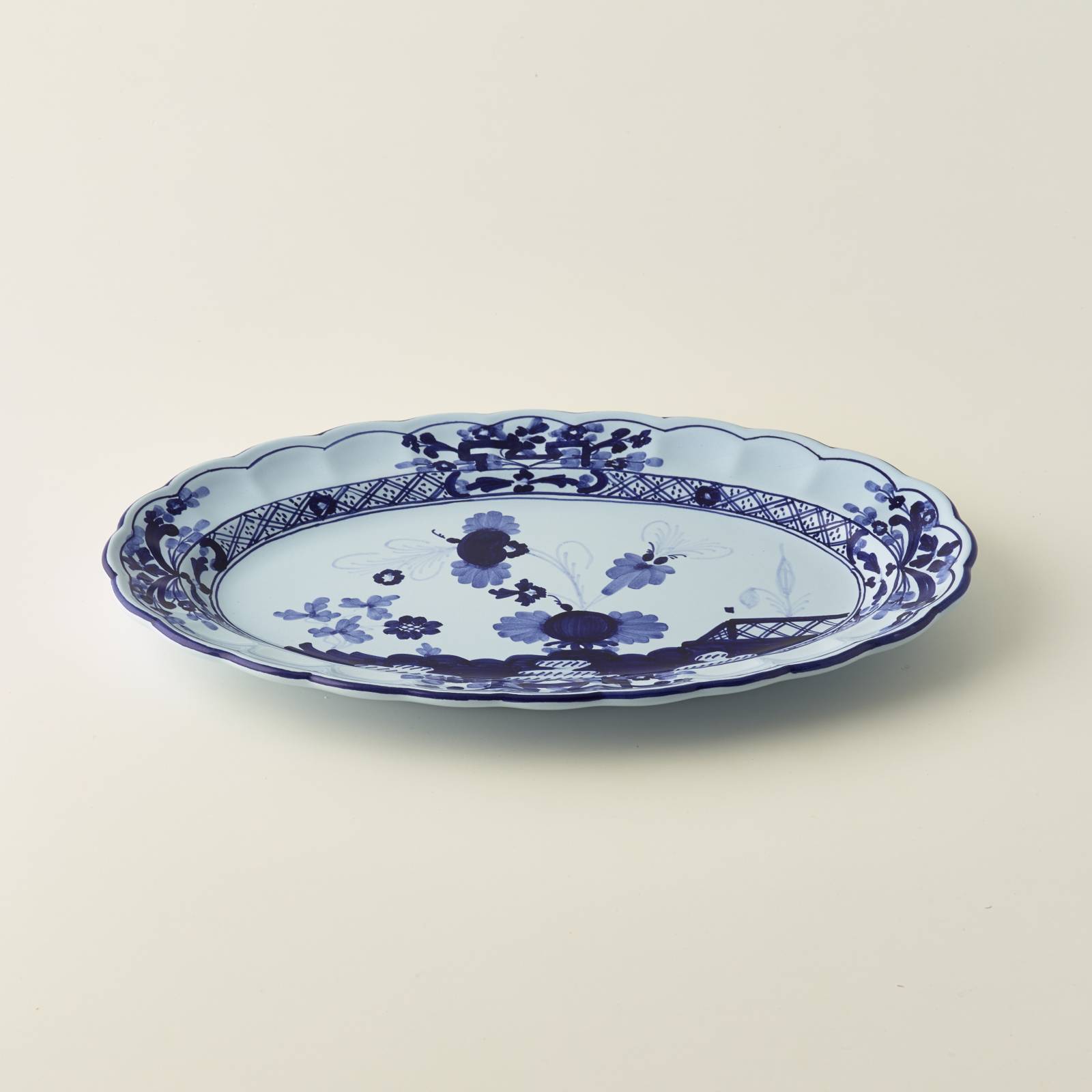 Together with the large oval plate, this small, oval majolica dinner plate may be used to complete the fish service, Ideal for stylish dinner tables, thanks to the contemporary Garofano Blu motif.