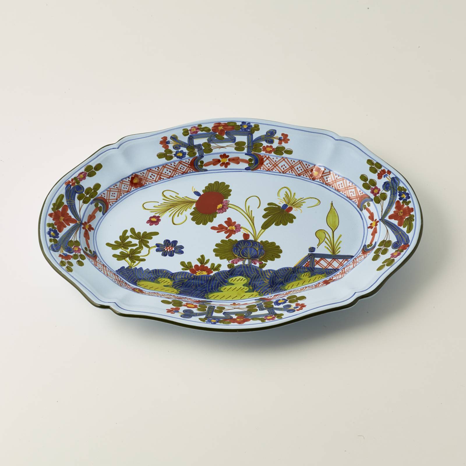 Questo Ovale da portata decorato a mano secondo il decoro Garofano Imola arricchisce il servizio da tavola in maiolica con campiture decise e brillanti.