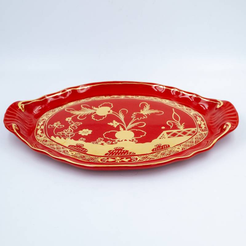 Questo vassoio può abbinarsi con tazzine da caffè, lattiere, zuccheriere, oppure per servire dei contorni e antipasti. Realizzato a mano con il motivo Garofano dipinto in oro zecchino da 24 carati. Un piccolo oggetto d'arte senza tempo.