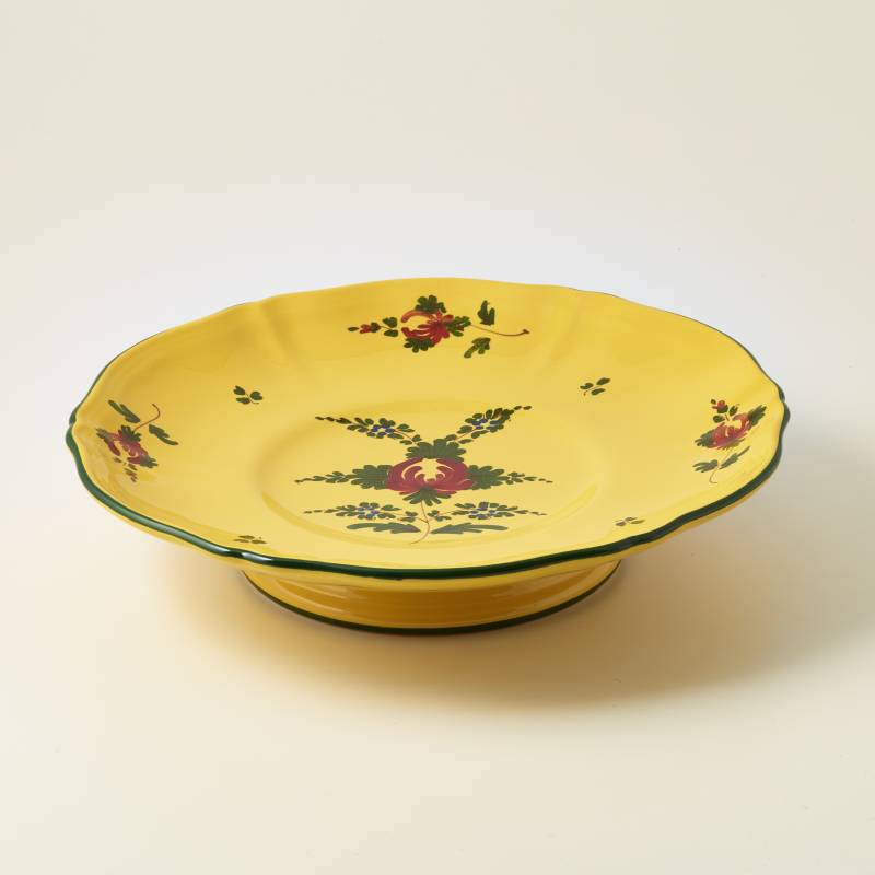 Questa fruttiera in maiolica, su piccolo basamento, arricchisce il servizio da tavola con il decoro Giallo Fiore. Ideale per servire gustose crostate e torte.