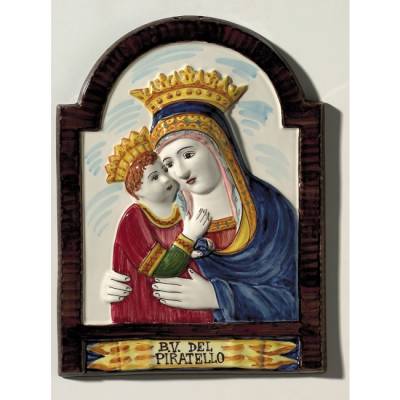 Un' incorniciatura semplice, densi i toni di giallo, rosso e blu per le gemme della corona e gli ornati delle vesti; tratti decisi sottolineano i particolari del volto e sintetizzano i contorni delle mani. La produzione di questa lipologia di targa è da ritenersi propria della fabbrica Bucci e poi di Cooperativa Ceramica d'Imola, che conserva ancora gli stampi originali. Mai completamente abbandonati, ma per alcuni decenni dimenticati, questi stampi costituiscono un piccolo patrimonio culturale riscoperto che sta al centro della produzione odierna della sezione artistica ImolArte.